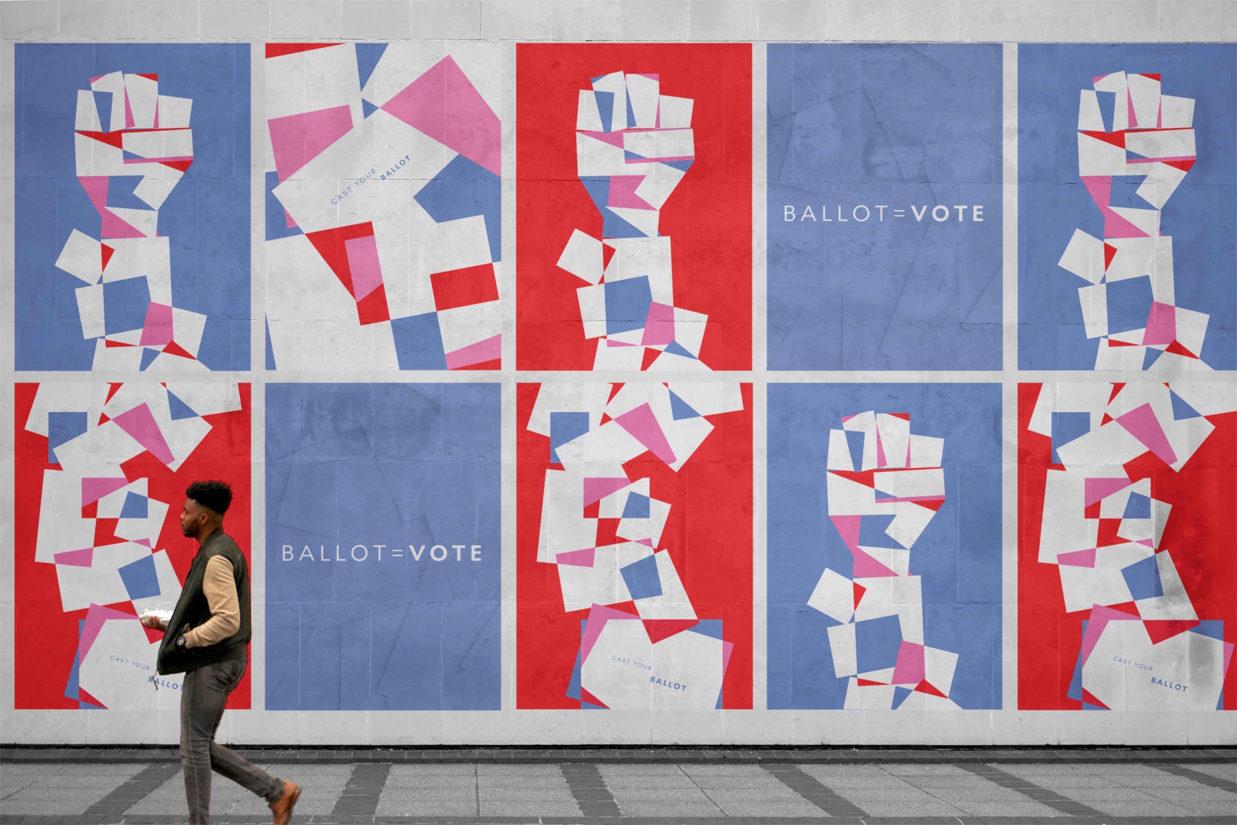As part of AIGA’s Get Out The Vote campaign to encourage voting, an identity system was created. They system includes posters, stickers and a tote bag depicting ballots joining together to build something new, showing the importance of every vote and how it can shape the future.