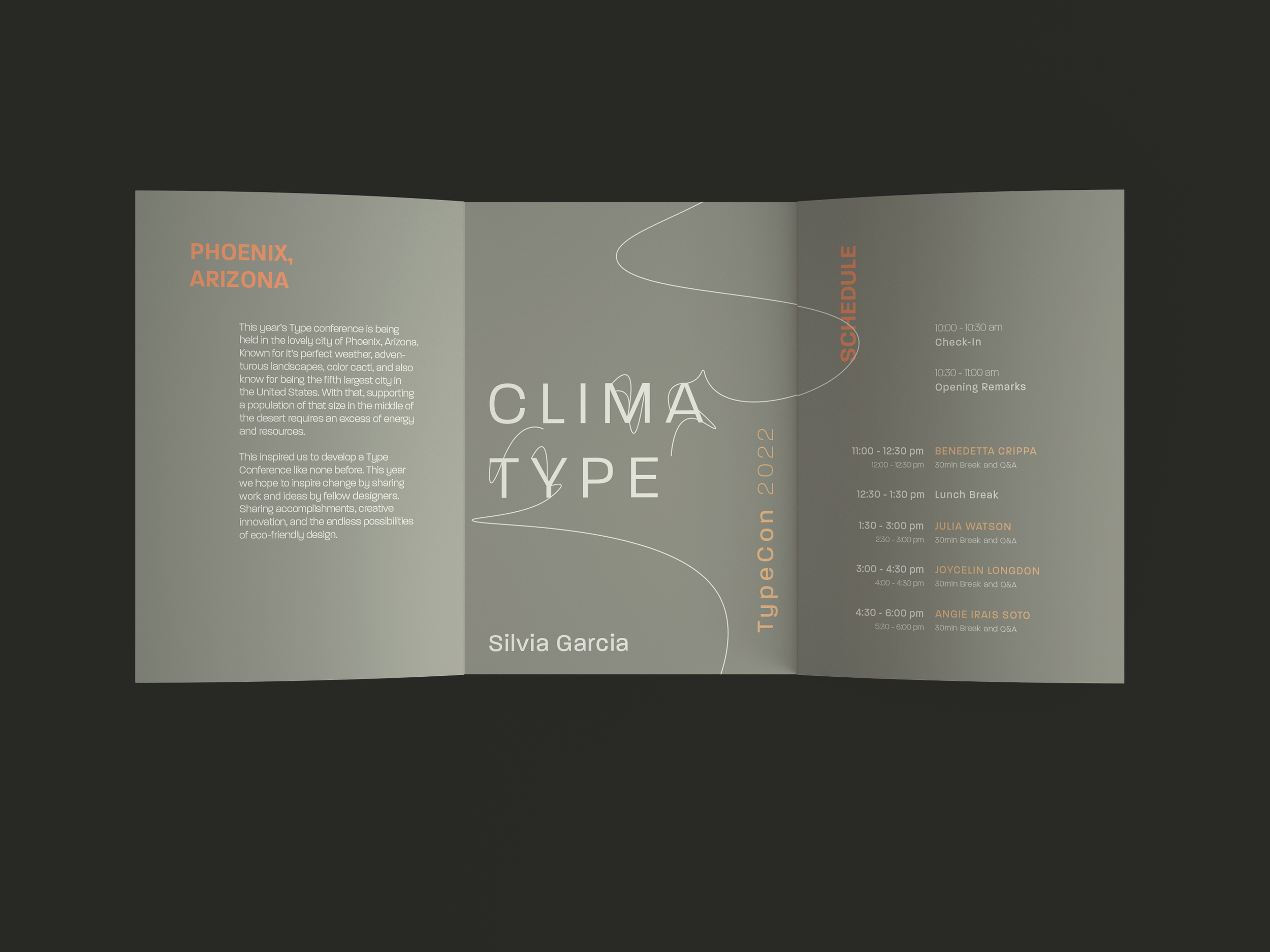 TypeCon Climatype is an identity system for an annual typographic conference held by an organization promoting study and support of typography and related arts. The theme is based on ways to improve sustainability in the design world. The visual concept is based on the location of the conference, which includes a gradient pattern depicting the landscape of Arizona. The identity system includes a poster, environmental graphics and collateral focused on sustainability.